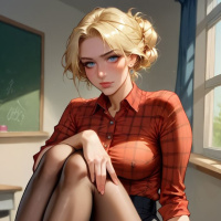 a relaxed pose. The setting appears to be an interior space that resembles a classroom or study room, indicated by the presence of a chalkboard and window with daylight streaming through. The artwork is detailed, showcasing the girl's character design with attention to shading and texture in her attire and hairstyle.