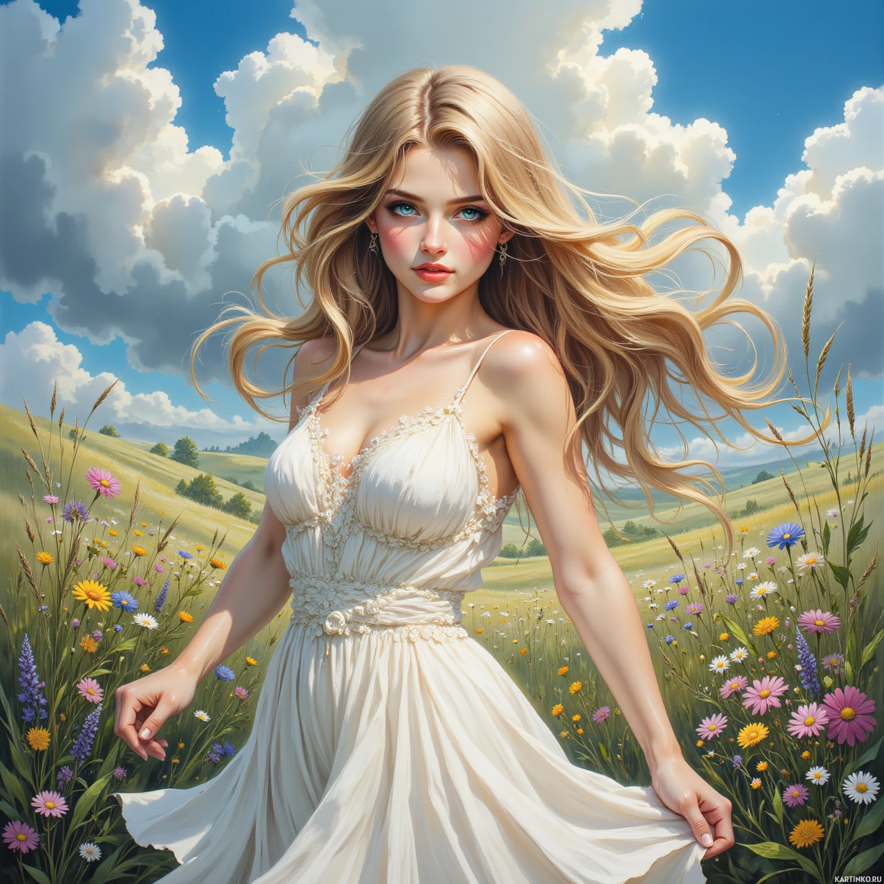 На картинке запечатлена блондинка с длинными волосами, словно замершая в движении: развевающиеся пряди и легкий подъем юбки создают ощущение полета. На ней воздушное, светлое платье, которое подчеркивает ее нежную кожу. Ее лицо выражает спокойствие, а взгляд устремлен вдаль, за пределы кадра. На заднем плане — идиллическая природа: по обеим сторонам тропинки, по которой она идет, цветут пышные цветы, а ясное небо намекает на весну или начало лета благодаря сочной зелени и полевым цветам.
