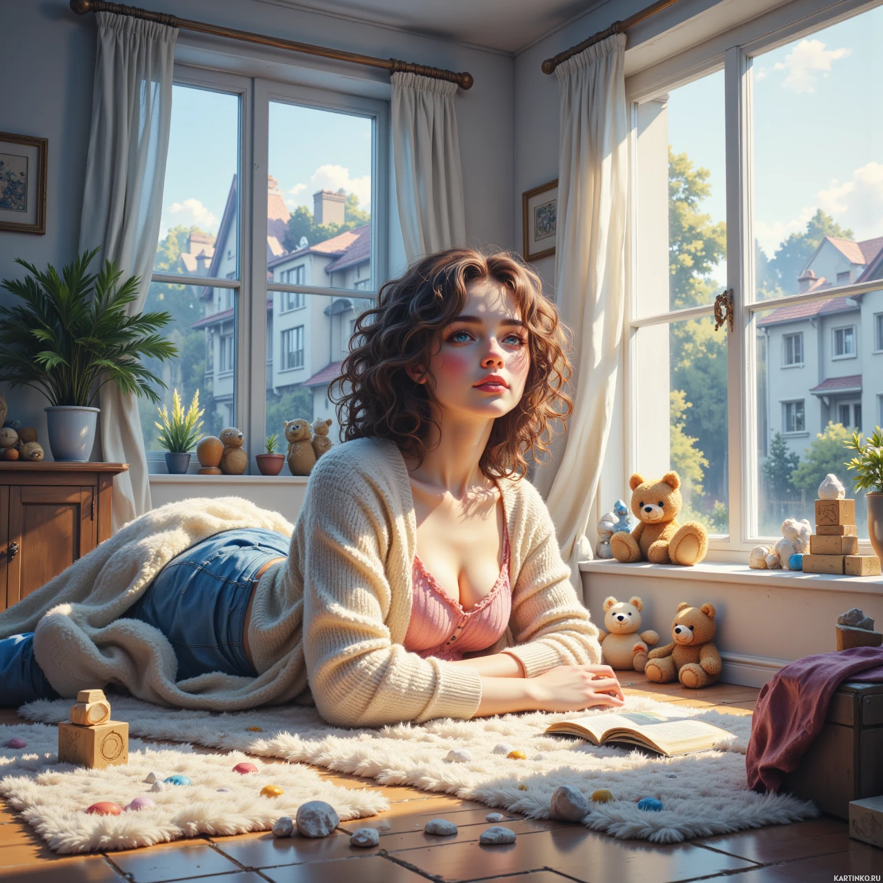 На картинке запечатлена молодая женщина, погруженная в состояние покоя. Она лежит на животе на ковре возле окна с белыми занавесками. Её тело расслаблено, голова удобно покоится на одной руке, а другая держит открытую книгу. Вокруг неё царит атмосфера детской беззаботности: повсюду разбросаны игрушки, рядом с ней – плюшевые мишки, в углу стоит комнатное растение, а книги небрежно разложены. В комнату проникает мягкий свет, освещающий сцену, создавая легкие тени и придавая картинке ощущение тепла.