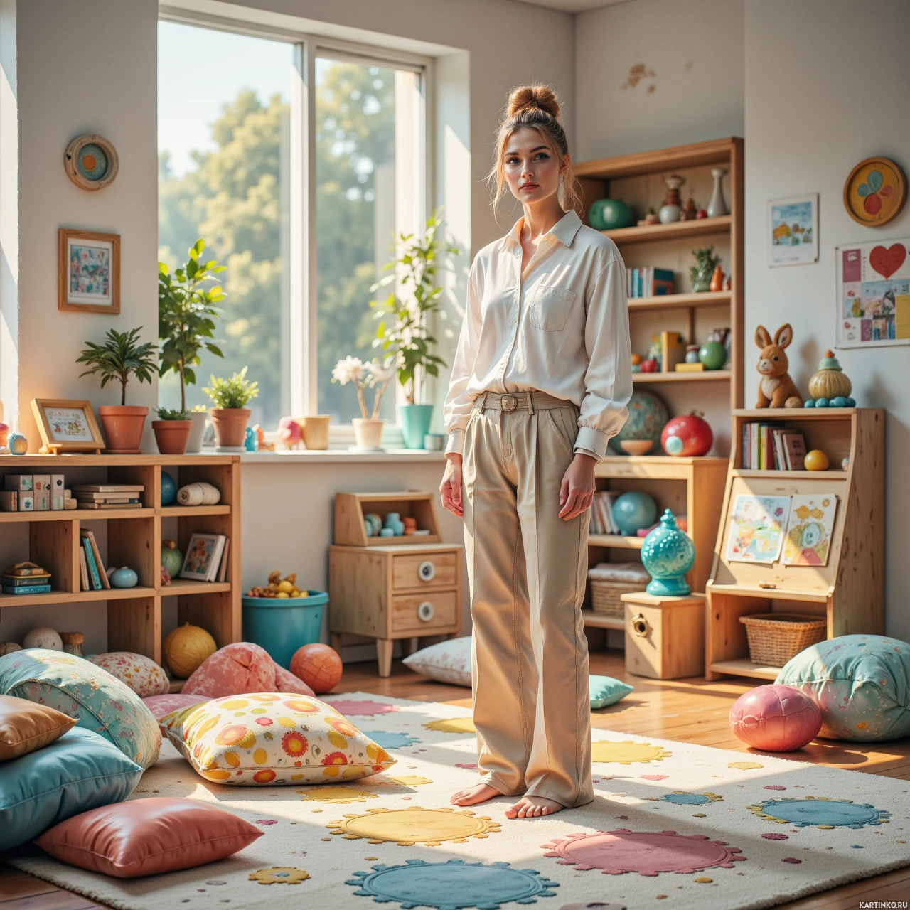 На картинке изображён человек, стоящий в комнате, похожей на детскую игровую или нянскую. На нём светлые брюки и рубашка с подвёрнутыми рукавами. Он босиком, что говорит о непринуждённой обстановке. За спиной виден источник естественного света, указывающий на то, что это день. В комнате много детских вещей: красочные подушки на полу, разбросанные игрушки и рисунки или украшения на стенах, которые говорят о том, что это пространство создано для маленьких детей.