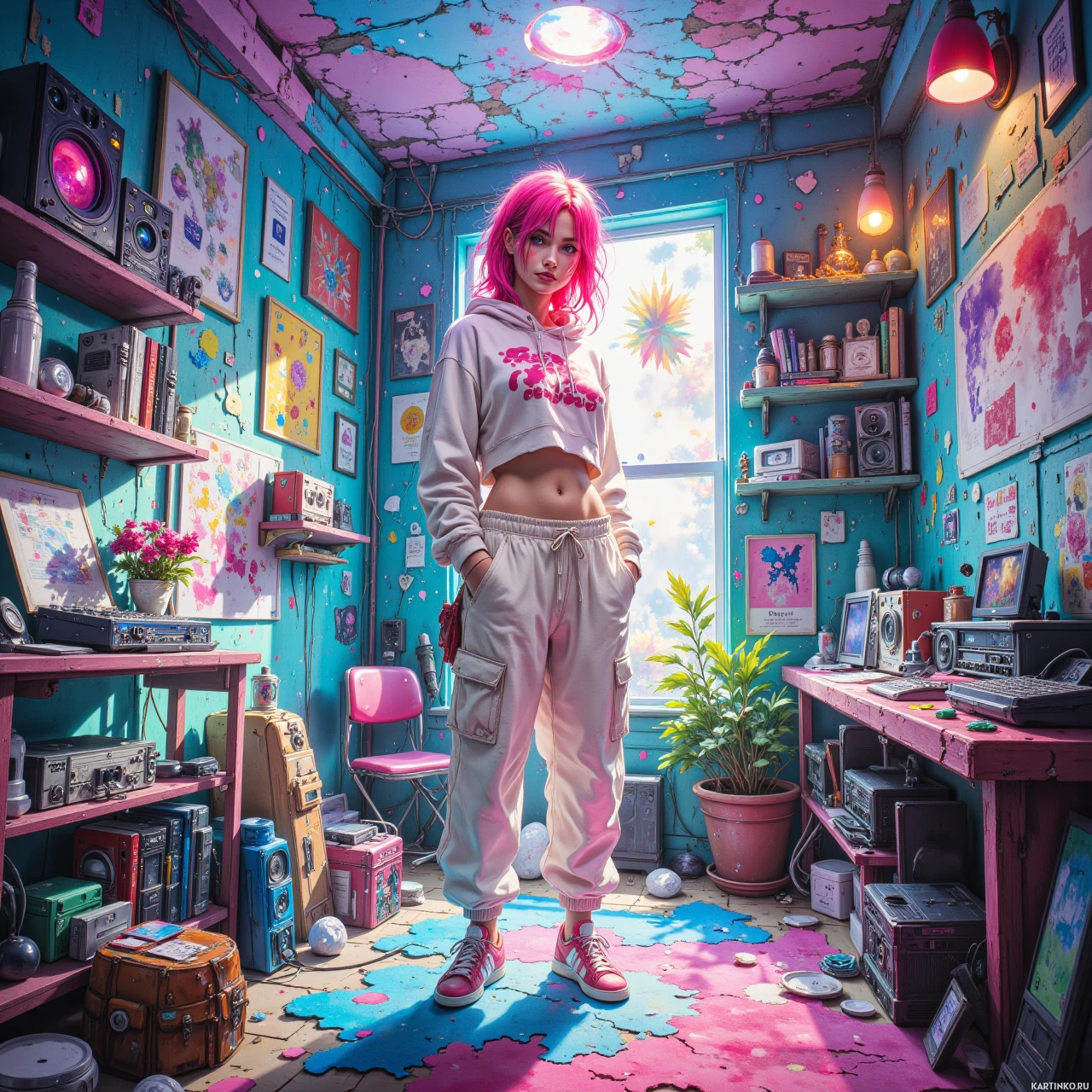 На картинке изображен человек, стоящий в эклектичном помещении, которое выглядит как творческая мастерская, заполненная разными предметами и ярким декором. У него розовые волосы и он одет в повседневную одежду: широкие светлые штаны и кроссовки. Он смотрит прямо в камеру. Вокруг него – буйство предметов: книги, картины на стенах, стол с электронными устройствами, полки с разнообразными вещами, включая растения, и другие декоративные элементы, создающие яркую и немного захламленную атмосферу. В пространстве чувствуется сильное личное самовыражение, отраженное в выборе произведений искусства и предметов. Стиль картинки указывает на то, что она могла бы быть обложкой альбома или рекламным материалом для музыки или искусства, учитывая ее стилизованное и насыщенное представление.