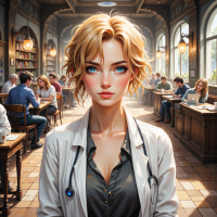 На этой картинке изображена молодая женщина с светлыми волосами и выразительными голубыми глазами. У нее светлая кожа, а волосы уложены легкими волнами, ниспадающими на плечи. Выражение ее лица серьезное и сосредоточенное, она смотрит прямо на зрителя. Она одета в профессиональный наряд, типичный для медицинской или научной сферы: белый халат поверх темной блузы. На ее шее виден фонендоскоп, что указывает на ее связь с медициной или исследованиями. На заднем плане - интерьер, напоминающий библиотеку или читальный зал с деревянными панелями и высокими потолками. Вдоль стен расставлены книжные полки, полные книг, за столами сидят люди, увлеченно работая. Освещение мягкое и теплое, создающее атмосферу учености.