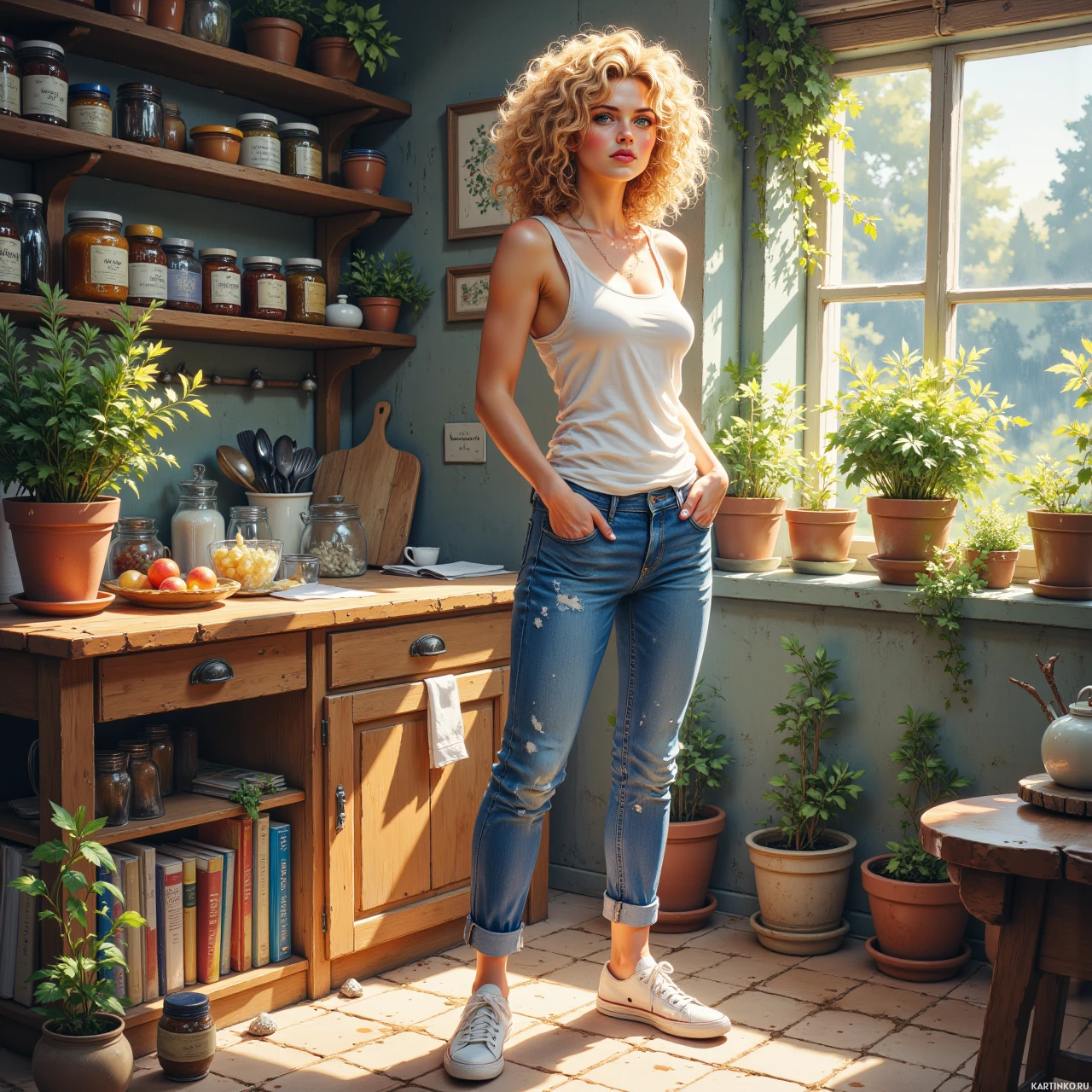 На картинке изображена женщина, стоящая на кухне, оформленной в винтажном стиле. У нее кудрявые светлые волосы, она одета в белую майку и потертые джинсы. На ней кроссовки, руки на бедрах. Комната с деревянными полками, заполненными банками и бутылками, и горшками с растениями создает уютную атмосферу. Солнечный свет из окон намекает на дневное время.