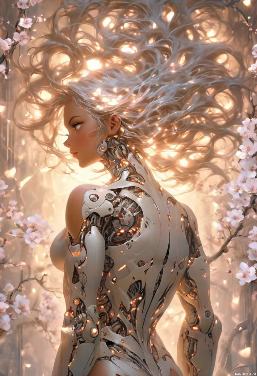 cherry blossoms, adding a touch of organic beauty to the otherwise technologically-inspired character.
