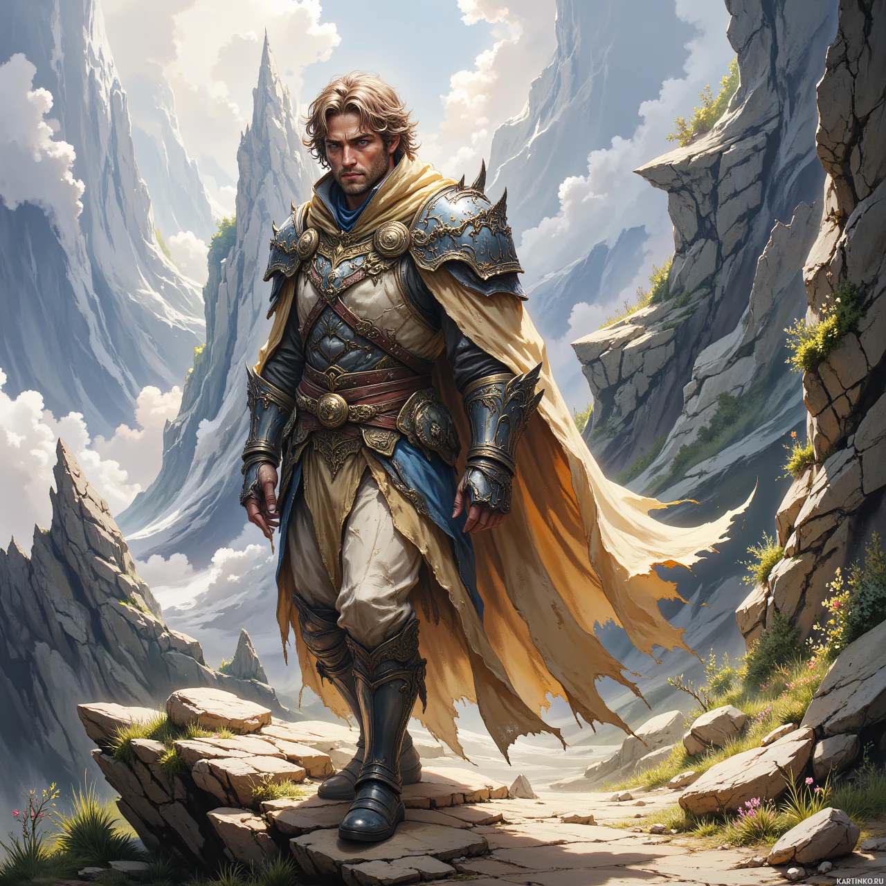 На картинке изображен мужчина в исторической броне, похожей на доспехи средневекового воина. На его голове шлем с перьями, а на левой руке – щит. Правая рука покоится на бедре, а на плечах накинут длинный плащ. На заднем плане возвышаются скалы и, кажется, горный ландшафт под пасмурным небом.