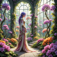На картинке молодая женщина с фиолетовыми волосами стоит перед арочным окном. На ней длинное, струящееся платье, украшенное сложным узором, словно сшитое из листьев или лепестков. Поза женщины говорит о том, что она смотрит вдаль, ее руки сложены на груди. На заднем плане — буйство цветов, преимущественно лиловых и розовых оттенков, которые устилают нижнюю часть картинки, создавая пышную и яркую атмосферу. Верхняя часть изображения заполнена арками, увитыми зеленью, образуя естественную крышу над сценой. Общий стиль картинки наводит на мысль о связи с фэнтези или сказочными мотивами, учитывая наряд женщины и причудливый цветочный фон.