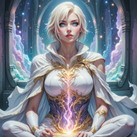 The image depicts a female character with white hair and a cloak. She is seated in a pose that suggests contemplation or magical ability, as she holds what appears to be a glowing crystal or orb within her hands. Her attire includes a sleeveless top adorned with intricate designs and what might be interpreted as a heart-like emblem on her chest. The background features ethereal colors and patterns that contribute to the fantastical theme of the image, which is commonly associated with genres such as high fantasy or video game artwork.