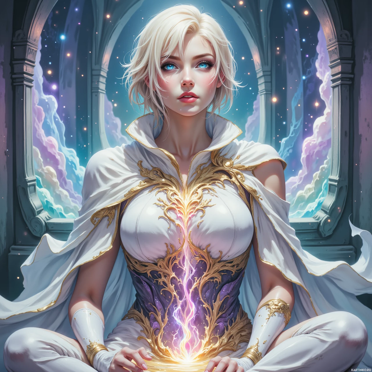 На картинке изображена девушка с белыми волосами и плащом. Она сидит в позе, намекающей на созерцание или магические способности, держа в руках светящийся кристалл или шар. Её наряд включает топ без рукавов, украшенный сложным орнаментом, и то, что можно интерпретировать как сердце на груди. Фон выполнен в нежных, сказочных тонах, что соответствует фантастической тематике картинки, характерной для жанров фэнтези или арта для видеоигр.