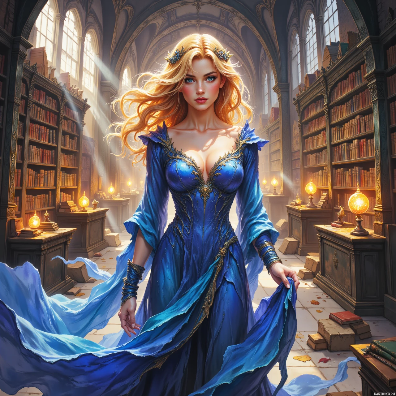 На картинке изображена персонажка, похожая на принцессу или героиню сказки, в фантастическом окружении. У неё длинные светлые волосы и роскошное голубое платье с замысловатым декором и аксессуарами, например, тиара на голове. По её позе можно предположить, что она идёт по библиотеке или комнате, заставленной книжными полками. Освещение в сцене приглушённое, с тёплым, рассеянным светом, исходящим от свечей или фонарей, расставленных по всему помещению. Выражение её лица сосредоточенное и спокойное.