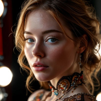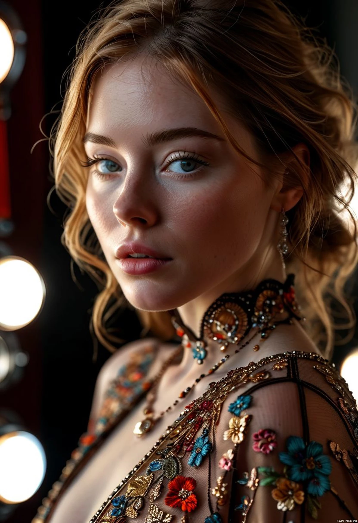 The image shows a young woman posing in front of a mirror with stage lights illuminating her from the top left and bottom right corners, casting a soft glow on her face. She has fair skin, clear complexion, and is looking directly at the camera with a neutral expression. Her hair is styled up, off her shoulders, revealing her neck and part of her chest. She is wearing an elaborate outfit that appears to be a bodysuit or dress adorned with small floral embellishments in various colors such as blue, red, yellow, and green. The garment has ruffled detailing around the neckline, adding texture to her look.