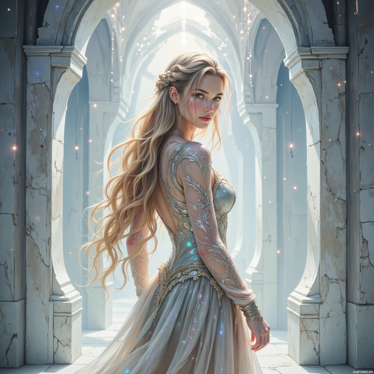 На картинке изображена девушка с длинными светлыми волосами в сложном платье, похожего на доспехи с замысловатым орнаментом. Она смотрит в сторону с сосредоточенным выражением лица и стоит перед дверью, образованной каменными арками, сквозь которые виден звездное небо. Вокруг неё мерцают маленькие кристаллы, создавая сказочную атмосферу.