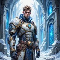 На этой картинке стоит мужской персонаж в здании, напоминающем собор. На нём доспехи, выполненные в стиле фэнтези или средневековья: металлические пластины с замысловатыми узорами и орнаментом. Доспехи имеют синий оттенок с золотыми акцентами, что может указывать на принадлежность к знатному роду или воинскому сословию. Поза персонажа выражает настороженность и готовность, руки сложены на бедрах, взгляд направлен вперед. Его волосы подстрижены не так давно. Вокруг него – большие арочные окна, через которые проникает мягкий свет, контрастирующий с твёрдостью его доспехов. Общий стиль картинки напоминает иллюстрации из фэнтезийных книг или игр.