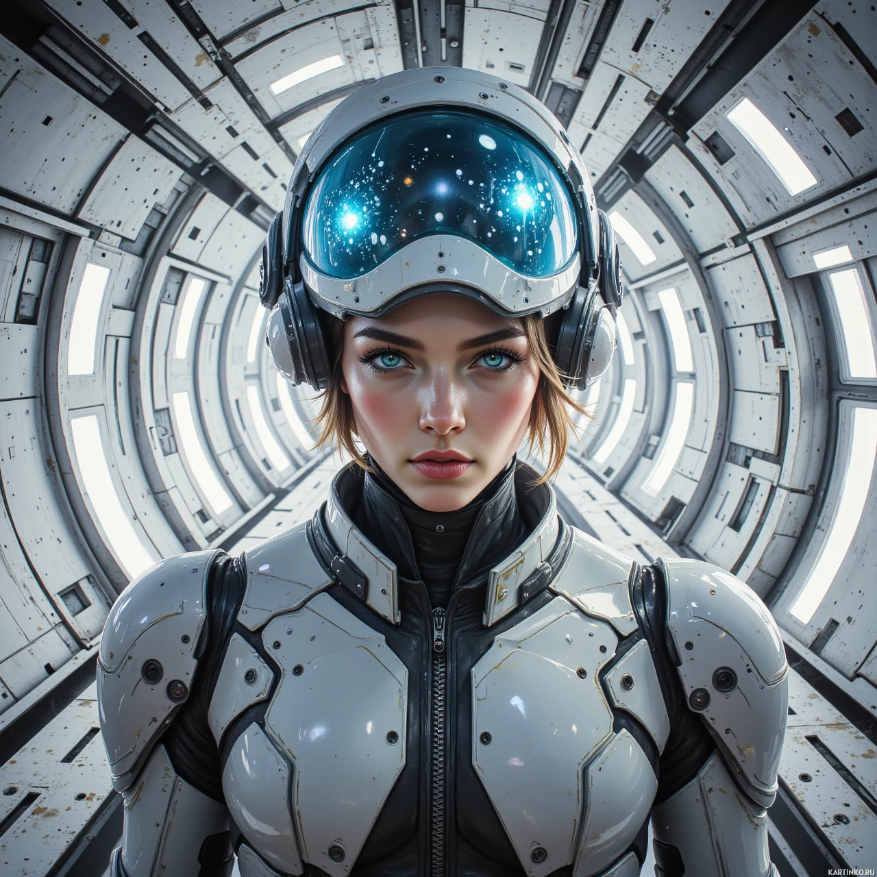 На картинке изображена девушка в футуристических доспехах, преимущественно белого цвета с черными и серебряными деталями. Дизайн брони – современный и обтекаемый, с высоким воротником, сочетающий в себе функциональность и стиль. На ее шлеме – визор, сквозь который видны глаза, выражающие сосредоточенный и задумчивый взгляд. Она стоит в помещении, напоминающем интерьер космического корабля или станции, с металлическими стенами, украшенными сложными узорами и освещенным мягким светом. Стиль картинки тяготеет к научной фантастике, намекая на сюжет, связанный с передовыми технологиями и, возможно, освоением космоса.