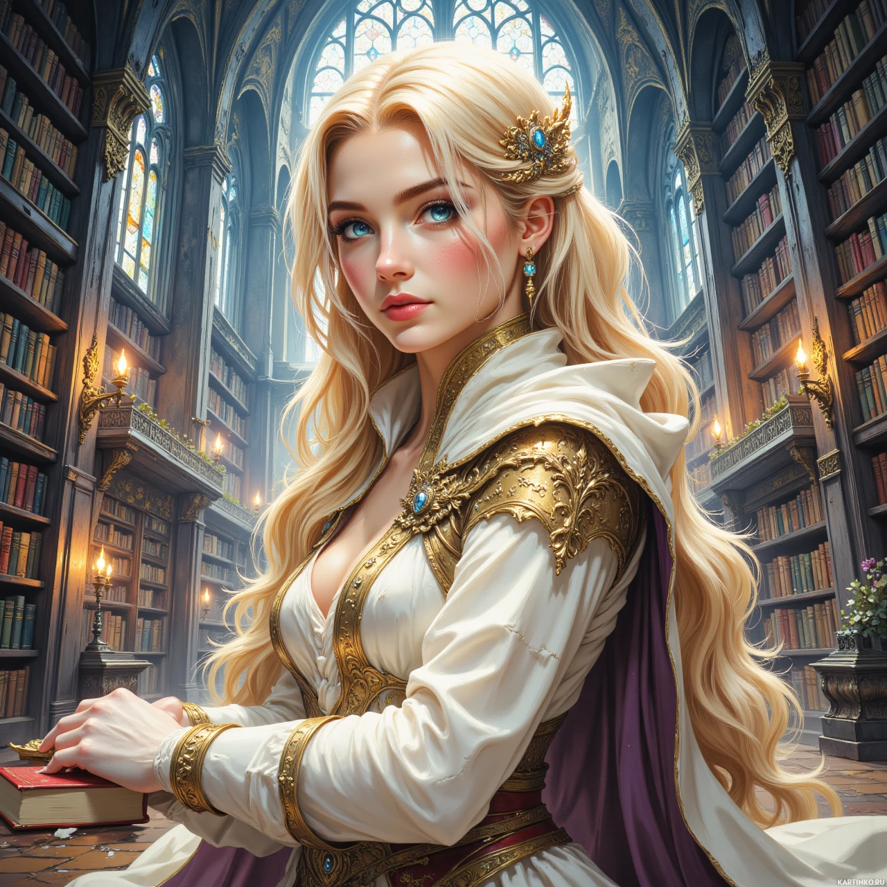 Картинка изображает женского персонажа, вероятно, из мира фэнтези или исторической эпохи, что подчёркивается стилем и деталями. У неё длинные светлые волосы и голубые глаза, а выражение лица говорит о благородстве и достоинстве. Она одета в светлый наряд, украшенный сложными узорами и драгоценными камнями, что указывает на высокий статус или, возможно, магическую принадлежность. На заднем плане – интерьер, похожий на библиотеку или храм, с высокими полками, заполненными книгами. Архитектура имеет готические или средневековые черты: арки, декоративные резные элементы. Мягкий свет от свечей создает атмосферу таинственности и увлеченности наукой. Взгляд персонажа направлен вдаль, на губах лёгкая задумчивая складка. Её осанка изящна и рассудительна: одна рука покоится на бедре, а другая держит открытую книгу или фолиант. Картинка передает ощущение тайны и интеллектуального любопытства, характерное для фэнтезийных историй.