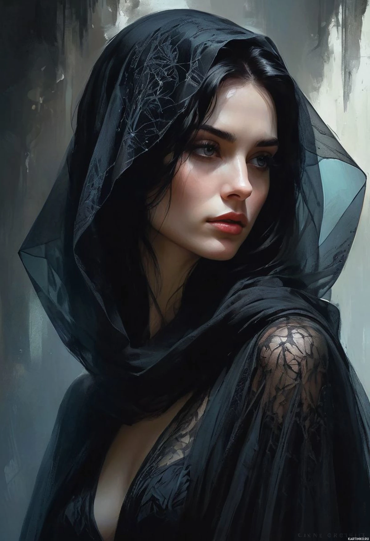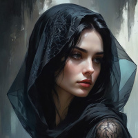 a black hood that covers her head, leaving only her face visible. Her makeup includes prominent