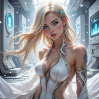 На картинке изображена девушка с белыми волосами. У нее светлая кожа, глаза подчёркнуты, создавая ощущение напряжённости. Её губы слегка приоткрыты, выражение лица нейтральное. Девушку украшают изящные украшения и высокий воротник, напоминающий шестерёнки или механизмы, что указывает на футуристическую или механическую тематику. Судя по всему, на ней доспехи или облегающий комбинезон с металлическими деталями, которые можно трактовать как часть гардероба или костюма. На заднем плане видны технологические приборы и панели, создающие неземную атмосферу.