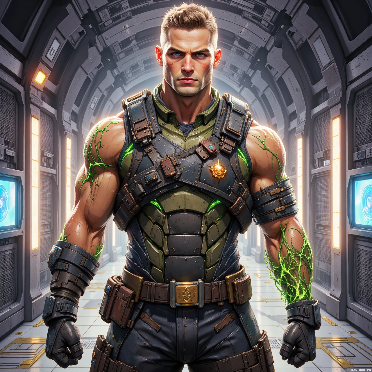 На картинке изображён мужчина, стоящий в, похоже, футуристической обстановке, возможно, в коридоре космического корабля, судя по дизайну и освещению. На нём тактический жилет, подчеркивающий крепкое телосложение, с видимыми бронепластинами на груди и плечах. Голова повернута немного в сторону, словно он смотрит на что-то за кадром, волосы короткие. На левой стороне груди у персонажа есть эмблема или знак отличия, но разобрать детали не удаётся. В правой руке, покоящейся у бедра, он держит, похоже, оружие.