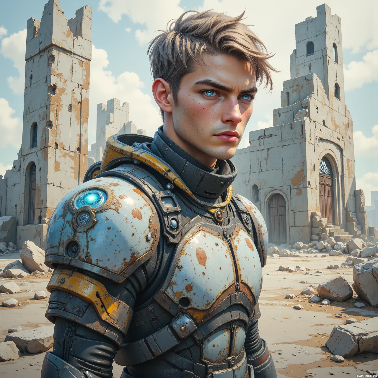 На картинке изображён персонаж, мужчина, стоящий в научно-фантастическом сеттинге. На нём футуристический костюм, сложный и детализированный, что позволяет предположить, что он может быть космонавтом или пилотом. Его экипировка включает в себя ремни и механические элементы, характерные для передовых технологий, используемых в космических исследованиях или боевых действиях. На заднем плане видны полуразрушенные строения, будто бы бывшие частью разрушенного города, намекающие на сюжет, связанный с выживанием или исследованием в постапокалиптической среде. Освещение мрачное, с тёплыми тонами, что усиливает суровую, футуристическую атмосферу сцены.
