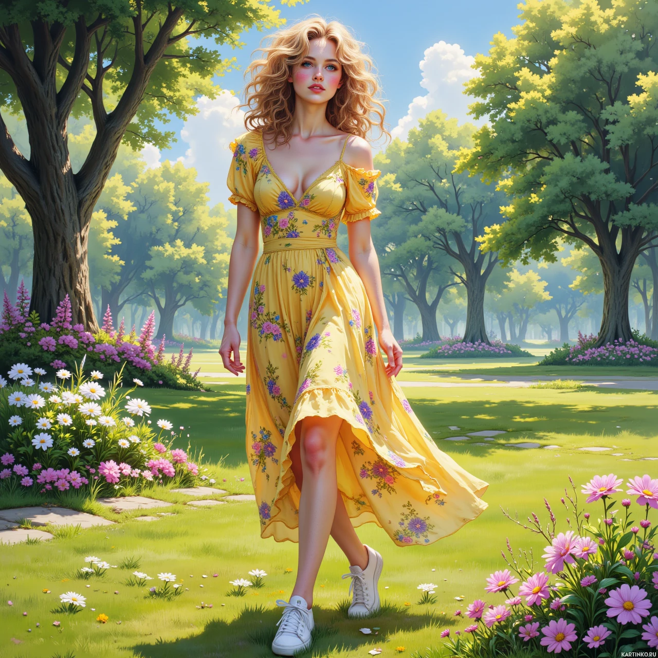 На картинке запечатлена молодая блондинка, прогуливающаяся по сочной зелени под ясным небом. На ней длинное, струящееся желтое платье с фиолетовыми цветочными узорами и короткими рукавами. Цвет платья контрастирует с её золотыми волосами. Под платьем – белые кроссовки. Вокруг ног расцвели розовые цветы среди зелени. Её волосы, ниспадающие на спину, обрамляют лицо, пока она смотрит в сторону от зрителя. На заднем плане – пышная растительность, извилистые тропинки, уводящие взгляд в даль, создавая ощущение глубины.