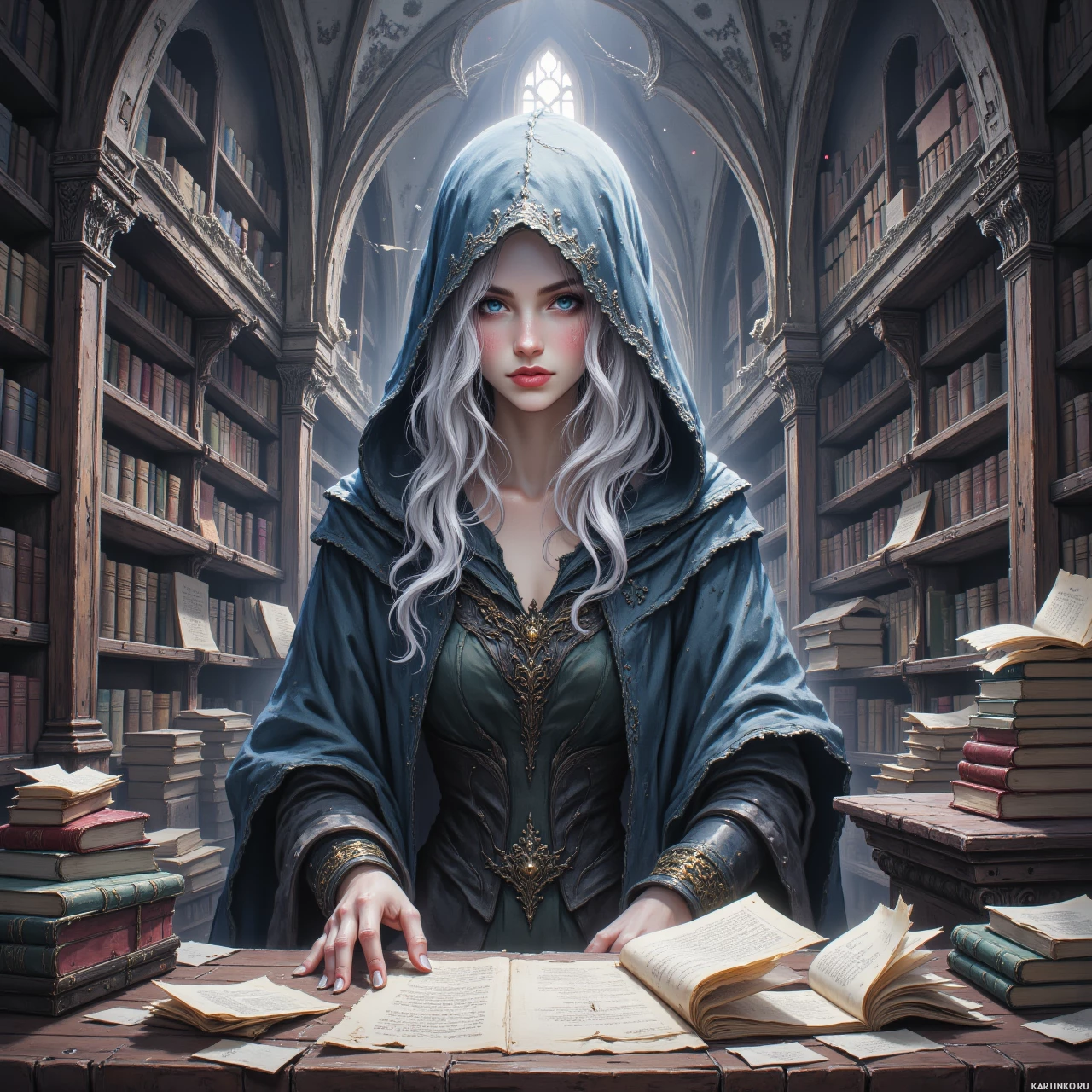 На картинке запечатлена молодая женщина с белыми волосами, выглядывающая из-под, кажется, капюшона. В ней чувствуется нечто неземное, волшебное, что подчеркивается сложными узорами на её одежде и аксессуарах. Действие происходит в старой библиотеке или кабинете, заставленном стопками книг и свитков. Перед ней стоит стол, на котором лежат раскрытые книги, перьевая ручка и несколько листов бумаги. Освещение приглушенное, но при этом акцентирует внимание на фигуре девушки на фоне библиотеки.
