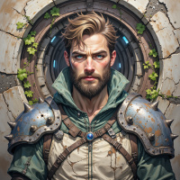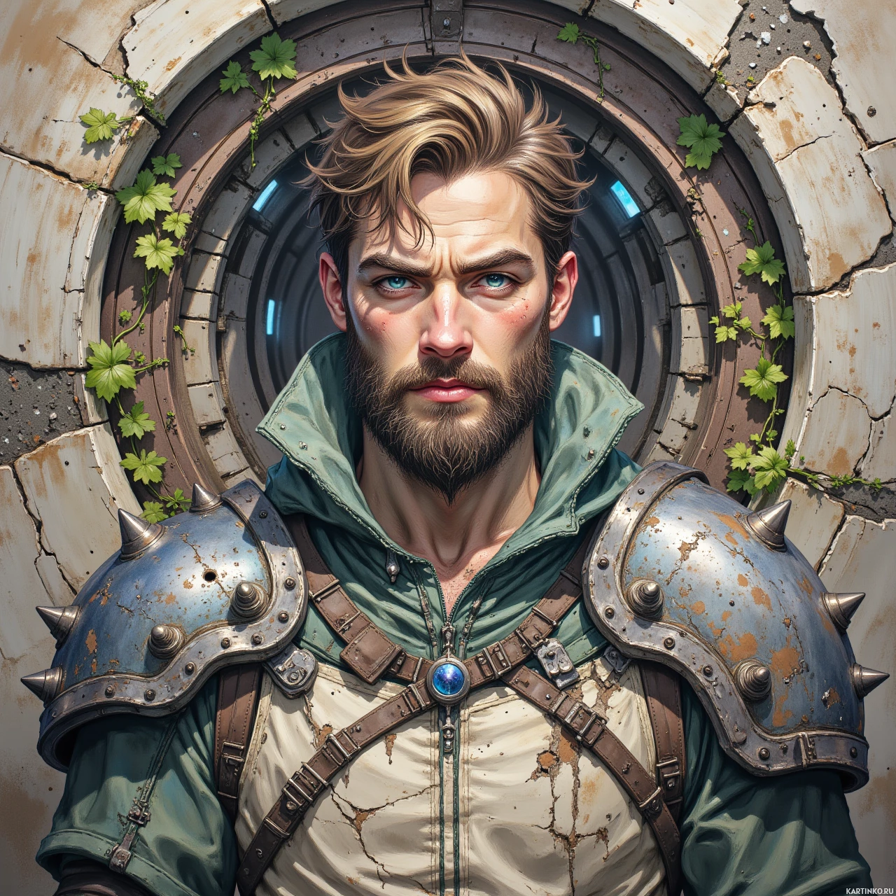 На картинке изображен персонаж-мужчина, выполненный в стилизованной манере, характерной для графики видеоигр. У него короткие волнистые волосы, а на нём доспехи с шипами на наплечниках и нагруднике. Выражение лица серьезное, и кажется, что он смотрит прямо на зрителя. Фон составляют индустриальные механизмы с шестернями и круглая структура, которая может быть частью большей механической системы или оружия. Также видны растения, пробившиеся сквозь трещины в, по всей видимости, ржавой поверхности, добавляя нотку органического контраста к механическим элементам.