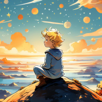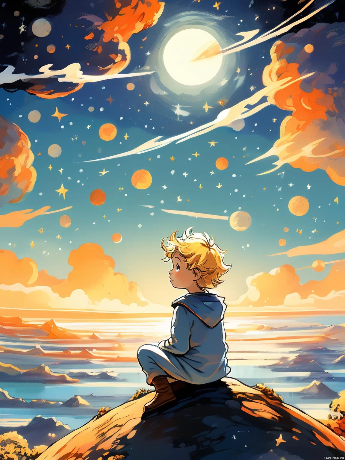shooting stars streaking across the sky, adding to the fantastical elements of the scene. In the background, there's an expanse of water that could be interpreted as an ocean or a sea, with floating islands or rocks visible on its surface. The colors in the artwork are rich and varied, ranging from warm hues near the horizon to cooler tones higher up, likely indicating the time of day being evening given the position of the moon. The overall style of the image is illustrative and detailed, with a blend of realism for the figure and environment and fantastical elements that suggest a magical or otherworldly setting. The artwork does not contain any specific information about children, so any inferences about them would be based on the imagination or additional context provided by the viewer.