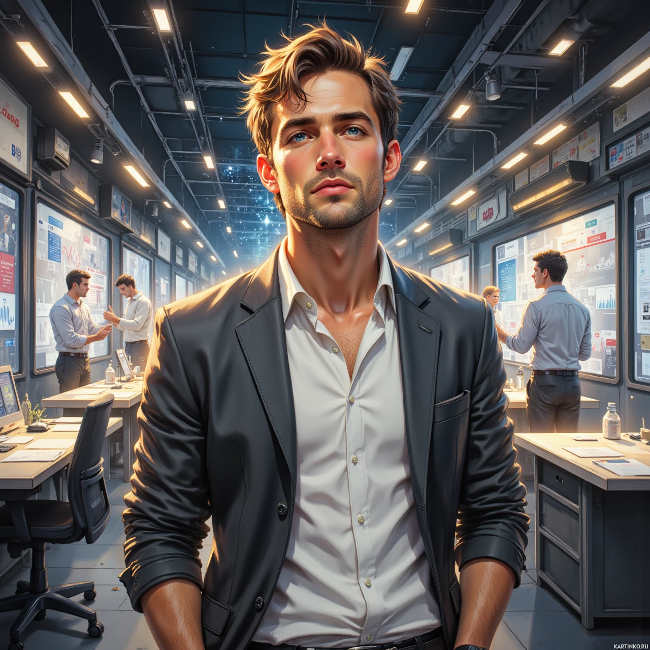 На картинке молодой человек в офисе. У него короткие каштановые волосы и он одет в строгий черный костюм с белой рубашкой, без галстука. Выражение его лица серьезное, взгляд направлен в сторону, рот слегка приоткрыт, как будто он задумался или собирается что-то сказать. На заднем плане виднеется офисная обстановка: несколько столов, компьютеры и различное электронное оборудование. Размытые фигуры других людей, работающих за своими рабочими местами. Освещение искусственное, ощущается атмосфера тихой сосредоточенности.