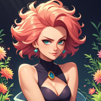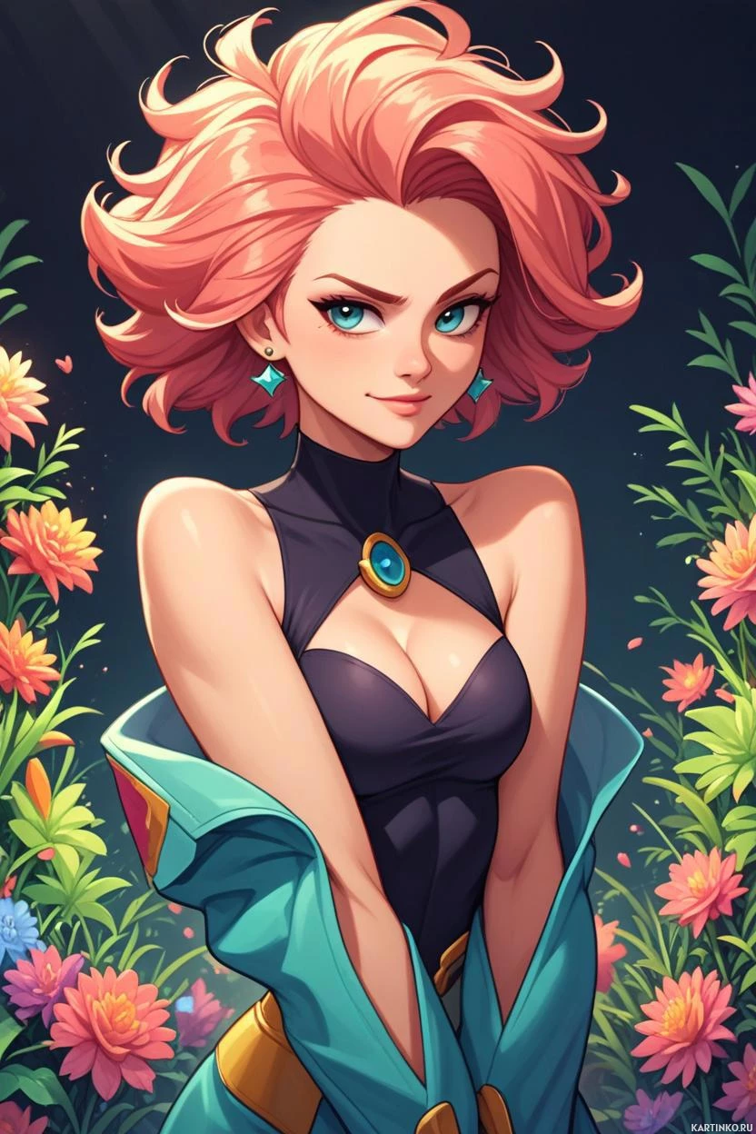 На картинке изображена молодая женщина с розовыми волосами. У неё голубые глаза и светлая кожа. Макияж включает в себя румяные щёки, тёмную подводку для глаз и нежный оттенок губ. На ней фиолетовый наряд с высоким воротником и чёрные перчатки. На груди у неё золотое украшение. На заднем плане – цифровые цветы, распустившиеся во всей красе.