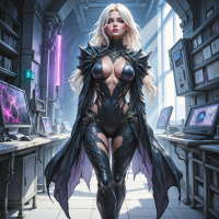The image features a character that appears to be a female with blonde hair. She is dressed in a black and silver armor-like outfit, which includes a breastplate with spikes and what seems to be a helmet or mask covering her face, allowing only the eyes to be visible. The style of the image suggests it may be related to fantasy or science fiction genres. The setting appears to be an indoor room that resembles a laboratory or workspace, with various technical elements such as electronic devices, screens displaying information, and what could be interpreted as scientific equipment. The overall atmosphere is one of high-tech, possibly futuristic, and there's a soft glow that seems to emanate from behind the character, giving a dramatic light effect.