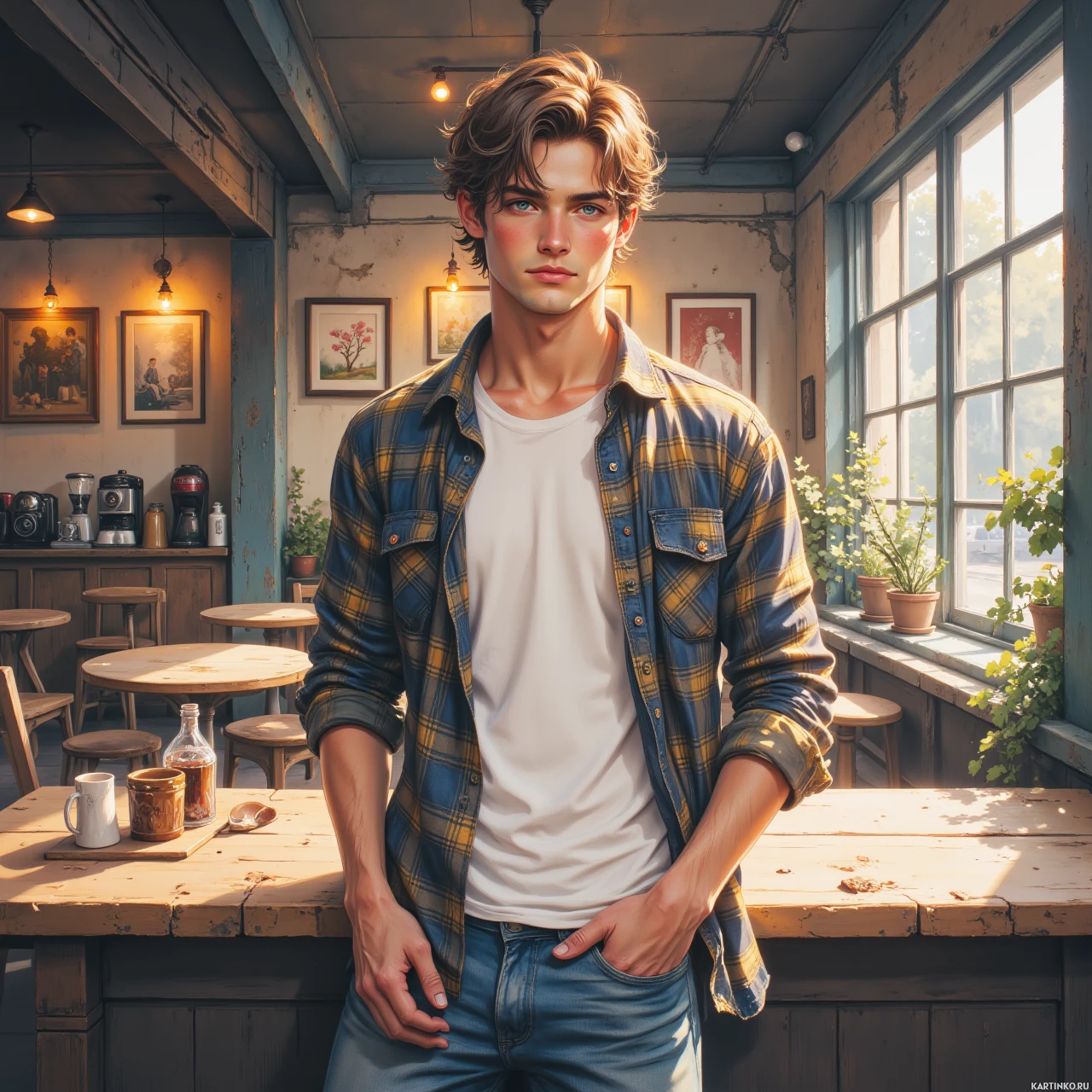 На картинке запечатлен молодой мужчина, позирующий в помещении. У него слегка растрепанные волосы, светлая кожа, он одет в клетчатую рубашку на пуговицах, надетую поверх белой футболки с подвернутыми рукавами. Джинсы на нем надеты небрежно, а одна рука засунута в карман. Место действия, похоже, деревенское интерьерное пространство, возможно, кафе или бар, с деревянными полами и столами. Рядом с ним на столе стоит комнатное растение, а вокруг разбросаны различные предметы, такие как бутылки и чашки. Естественный свет проникает через окна, из которых видны деревья, создавая ощущение близости к природе. Картинка обладает живым, динамичным качеством благодаря направленному освещению, которое подчеркивает черты модели и создает ощущение глубины.