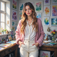 На картинке изображена молодая женщина, стоящая в помещении, напоминающем творческую мастерскую. Она смотрит прямо в камеру с нейтральным выражением лица, с распущенными волосами, ниспадающими на плечи. На ней светлая розовая рубашка, возможно, под розовым же свитере, и бежевые брюки. Слева от неё висят несколько картин, что намекает на её причастность к искусству или творческой среде. В комнату проникает естественный свет из окна, расположенного справа. На столе раскиданы бумаги и рисунки, что говорит о том, что это пространство также может использоваться для творческой работы или планирования. Общий стиль картинки выглядит как случайный снимок, возможно, предназначенный для профессионального профиля, учитывая одежду и обстановку.