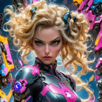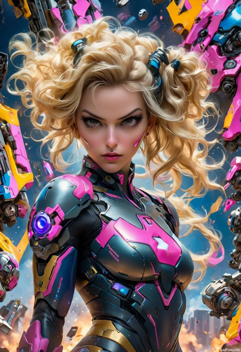a female character with long blonde hair styled in buns. She has striking blue eyes and is wearing an armored outfit that appears to be made of a metallic material with pink accents, suggesting she might be from