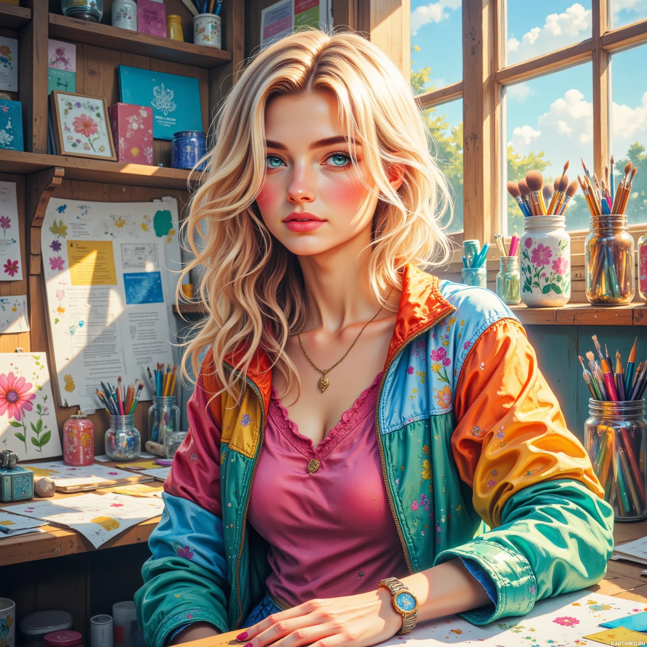 На картинке молодая женщина с светлыми волосами и голубыми глазами сидит за столом в помещении, похожем на мастерскую или художественную студию. На ней разноцветная куртка поверх розовой рубашки, а на шее – золотое ожерелье. Стол перед ней завален различными материалами для творчества: карандашами, ручками, кисточками и маленькими баночками, возможно, с красками или другими художественными материалами. Комната кажется уютной и яркой, с деревянными стенами и полками, уставленными вазами с цветами.
