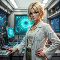На картинке – девушка с светлыми волосами, словно находящаяся в высокотехнологичной научной лаборатории. У неё сосредоточенное выражение лица, она стоит прямо. Вокруг – различное оборудование, намекающее на научные исследования или эксперименты. Компьютерные экраны демонстрируют графики и данные, возможно, связанные с космическими исследованиями или подобной области. Справа от девушки – ряд научных приборов, среди которых можно различить спектрометр или что-то вроде линзы телескопа. Освещение в кадре яркое, что указывает на помещение с искусственным освещением.