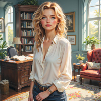 На картинке изображена женщина, стоящая, по всей видимости, в офисе. У нее длинные светлые волосы, она смотрит немного в сторону с нейтральным выражением лица. На ней белая рубашка с расстегнутым воротом, темные брюки и ботинки. В комнате – офисная мебель: стол с книгами, стулья, декоративные предметы, такие как вазы. В помещение попадает естественный свет из окон.