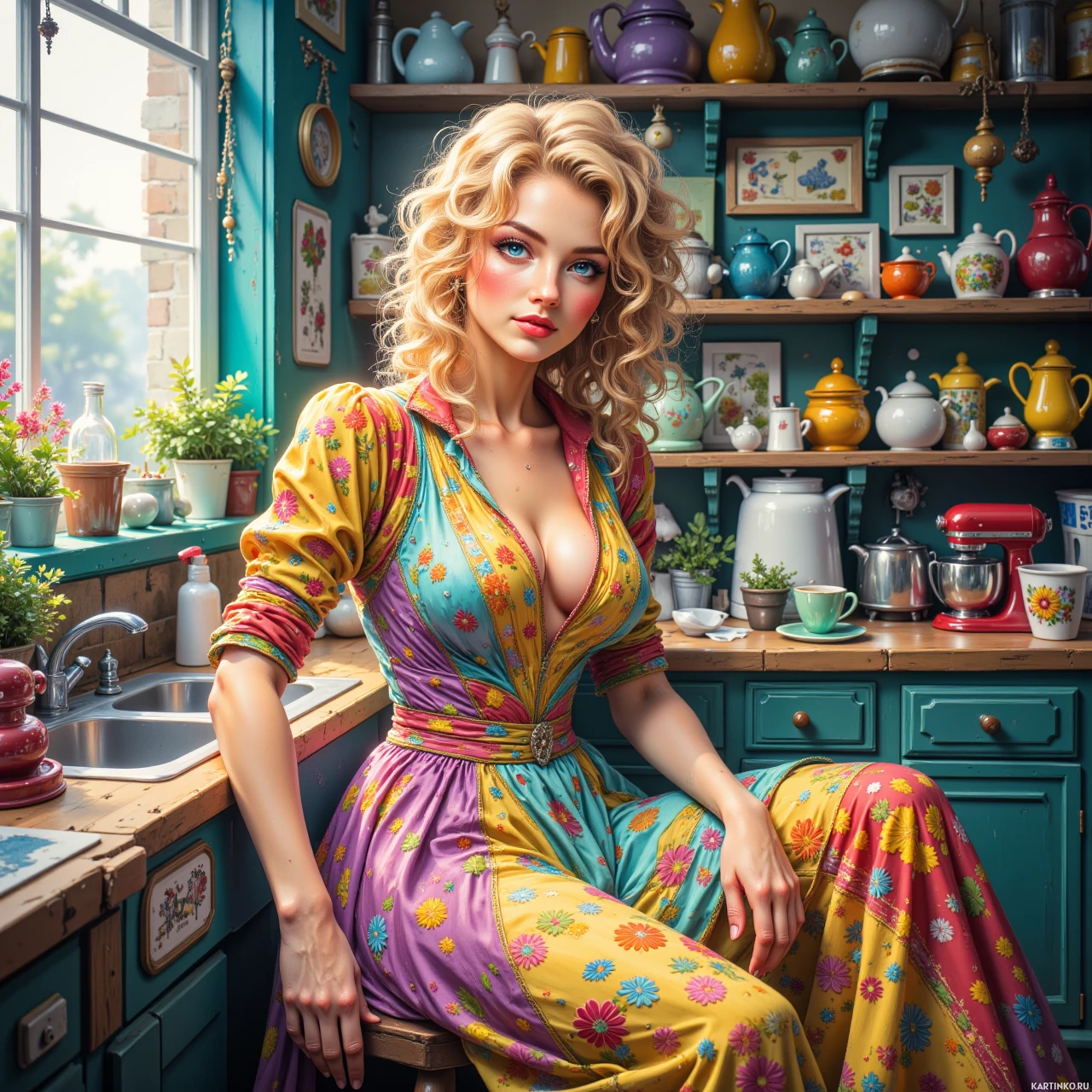 A woman with light skin, blonde hair, and striking blue eyes sits at a kitchen counter. She wears a vibrant, colorful dress that suggests a retro or bohemian style. The kitchen behind her is adorned with wooden cabinets painted in various pastel colors. Shelves filled with an array of teapots and other kitchenware can be seen. On the counter near her, there are some cups and bowls, and potted plants add a touch of greenery to the scene.