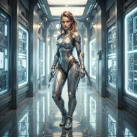 На картинке изображена женщина, стоящая в передовом технологическом окружении, словно из научно-фантастического мира. На ней футуристическая броня, а на лице – серьёзное выражение. За её спиной – панели с голографическими дисплеями и, похоже, интерфейсами управления или мониторами. Освещение выполнено в синих тонах, что может указывать на то, что она находится под землёй или на космическом корабле. Присутствие героини отсылает к темам футуристической войны, исследования или конфликта.