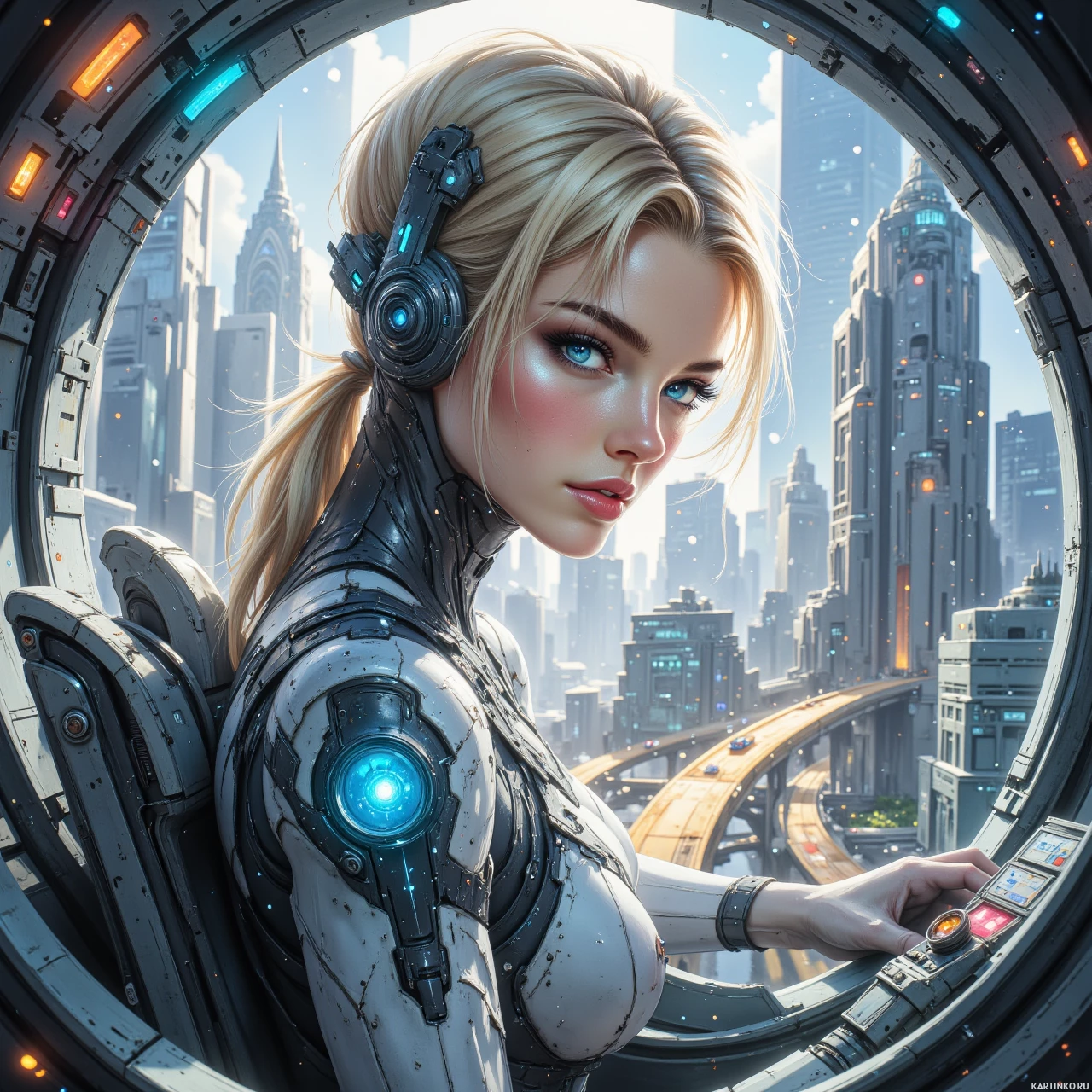 The image features a character with blonde hair wearing futuristic armor and headgear that suggests advanced technology, possibly for communication or interface with machinery. The character is sitting within what appears to be a cockpit or control center with various gauges and screens indicating a high-tech environment. In the background, there is an urban landscape indicative of a science fiction setting. This includes towering skyscrapers and an intricate network of roads and bridges that suggest a densely populated metropolis. The architecture has a futuristic look with sleek lines and reflective surfaces.