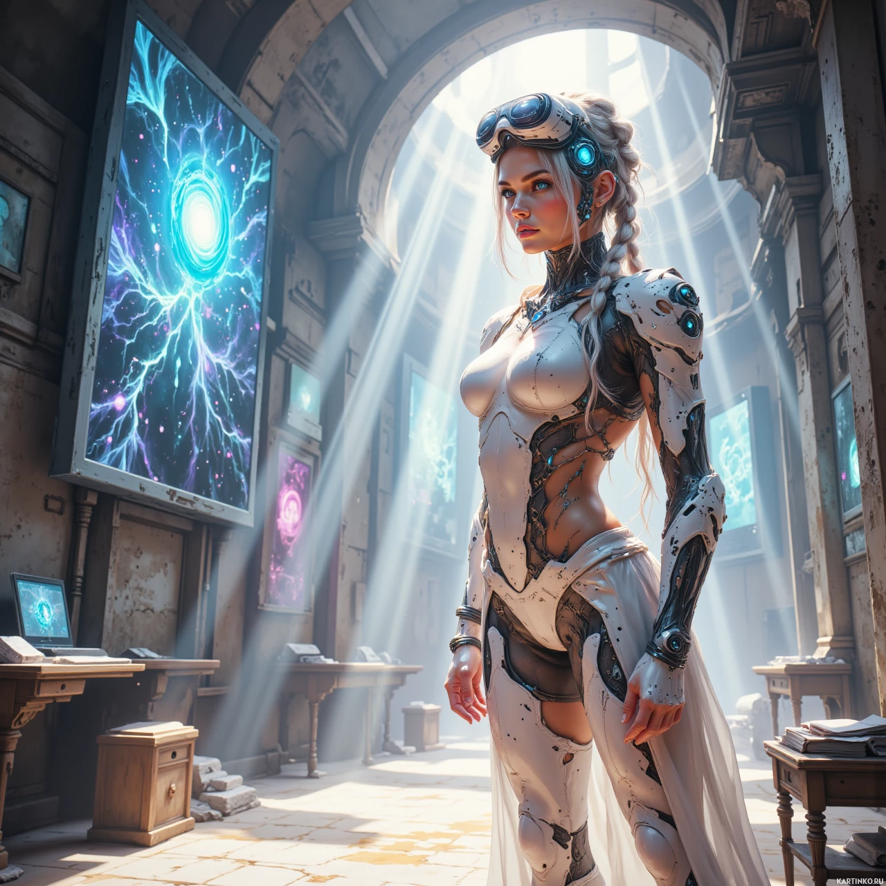 Картинка изображает женщину с белыми волосами в футуристических доспехах со сложной отделкой, что указывает на научно-фантастический сеттинг. Она стоит в арочном проеме, сквозь который льется свет, намекая на яркую сцену за ним. На заднем плане видны элементы передовых технологий и экраны с отображением, по всей видимости, научных данных или схем. На стенах – художественные изображения человеческих мозгов. Ее поза расслабленная, но уверенная, руки по бокам, взгляд направлен на что-то или кого-то за кадром.