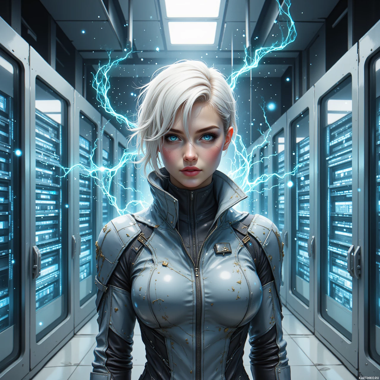 На картинке изображена женщина с белыми волосами, смотрящая влево. У нее поразительные голубые глаза, и она, кажется, находится в футуристическом окружении. На ней комплект брони, напоминающий силовую броню или продвинутое тактическое снаряжение. Вокруг ее головы видны искры или молнии, намекающие на способность к манипулированию электричеством или энергией. На заднем плане – ряды компьютерных серверов или панелей оборудования с множеством мигающих огней и кабелей, создающих атмосферу высокотехнологичной среды.
