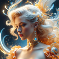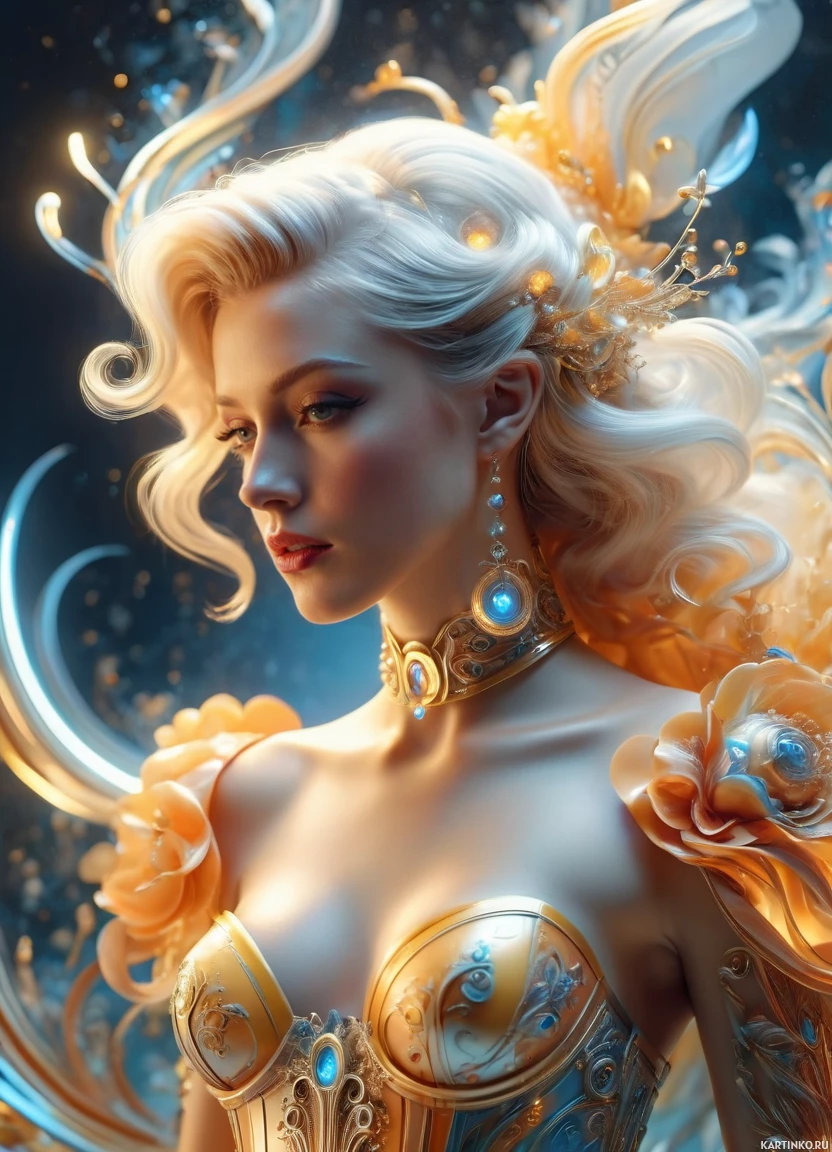 an ornate necklace with a large blue gemstone prominently featured. Additionally, there are intricate shoulder pieces that add to the overall embellished appearance of her attire. The character's skin is pale, and she has a tattoo or mark on her left arm near the shoulder area. Her expression is calm and serene, with a slight gaze directed towards something outside the frame. The background features swirling patterns that could be interpreted as magical energy or elements of nature, enhancing the fantasy feel of the image.