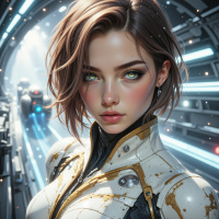 На картинке изображена девушка с поразительными голубыми глазами и каштановыми волосами. У нее светлая кожа, и она, похоже, одета в футуристическую броню, сочетающую металлический серый и золотистые оттенки. Выражение ее лица нейтральное, с едва заметным ретушированием, что часто встречается в цифровом искусстве или иллюстрациях для подчеркивания черт. Фон указывает на высокотехнологичное окружение, возможно, космический корабль или футуристическая среда.