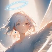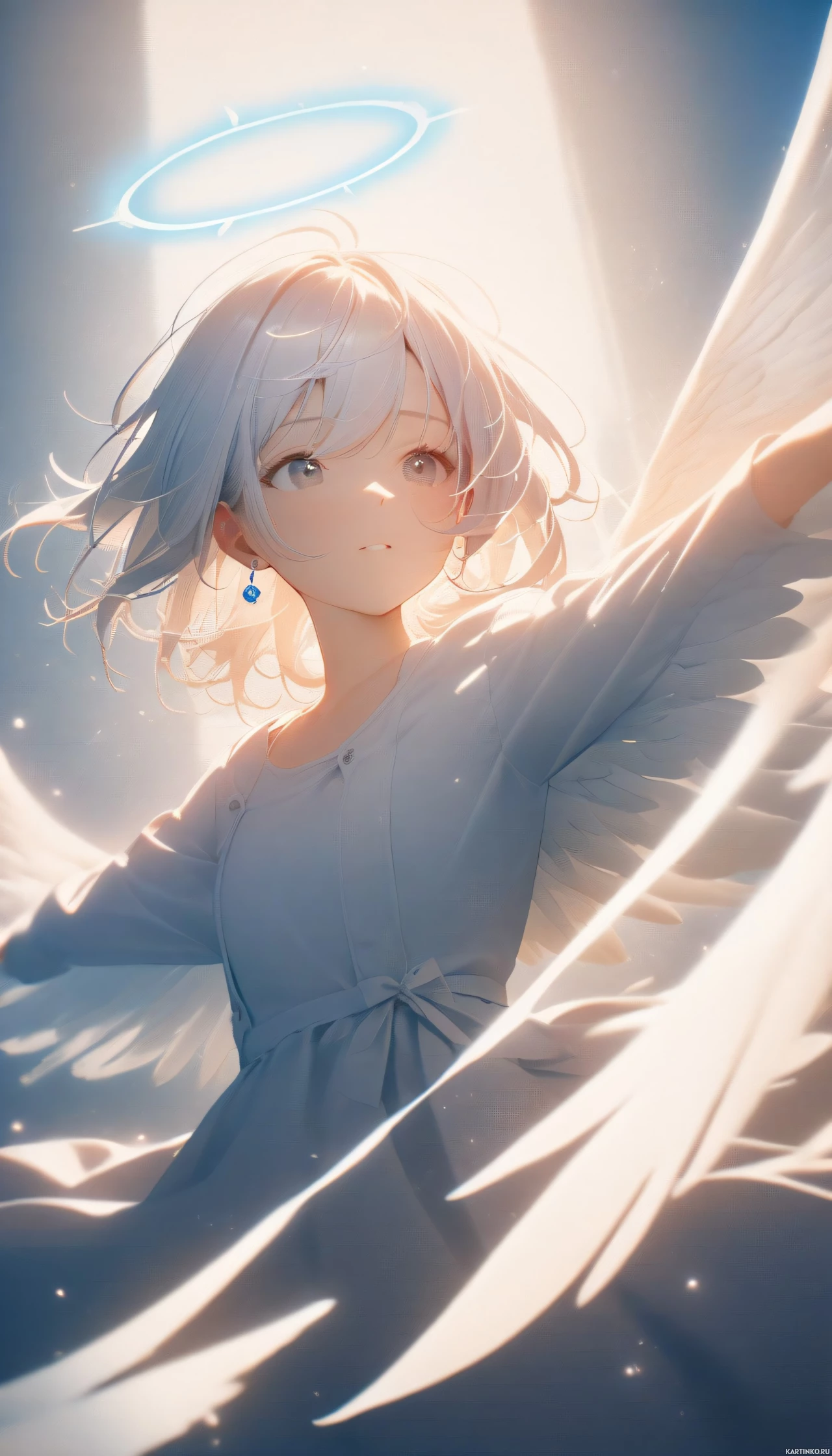 white hair and what appears to be angelic wings, likely indicating that she is meant to represent an angel or similar celestial being. She has large