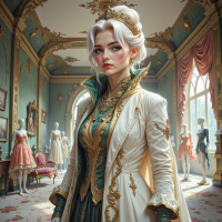 The image depicts a young woman with white hair, standing in an ornate room that suggests it could be from a historical setting. She is wearing an elaborate costume consisting of a green coat adorned with gold embroidery and a high collar, paired with a matching skirt that appears to have intricate designs. Her hair is styled upwards and she has a neutral expression on her face. The room around her features elegant furnishings such as chairs and tables, with mirrors reflecting the grandeur of the space.