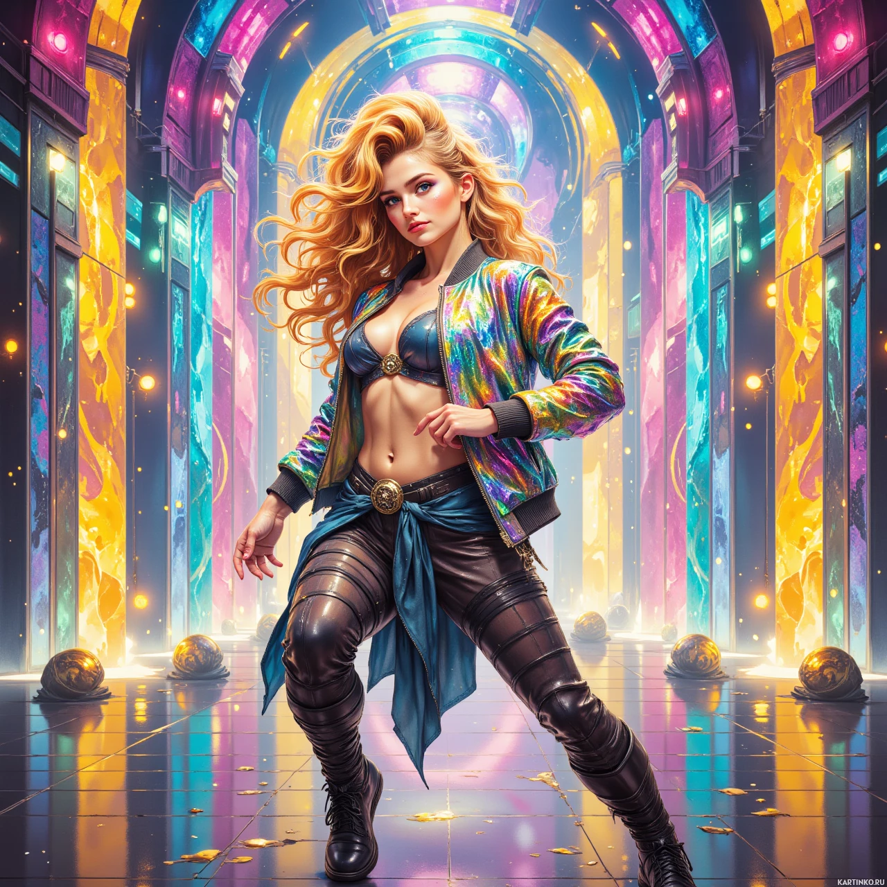 На картинке изображена девушка, стоящая в центре ярких, красочных арок с подсветкой. У неё длинные светлые волосы и на ней металлический, многоцветный жакет поверх, кажется, топа или боди. На ней также кожаные брюки и ботинки, дополненные различными ремнями и пряжками, что придает ей дерзкий, футуристичный образ. Она уверенно стоит, положив одну руку на бедро. Фон насыщен неоновыми цветами, что создает энергичную атмосферу картинки.