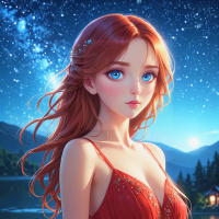 red hair and is wearing a strapless red dress with golden embellishments that suggest a classical or fantasy design. The background consists of a serene landscape, likely