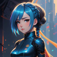 На картинке изображена молодая девушка с голубыми волосами, собранными в два хвостика с челкой, украшенными, по всей видимости, черными аксессуарами или заколочками. У нее заметные бакенбарды, и она смотрит прямо в камеру с нейтральным выражением лица. На ней синий кожаный костюм, включающий нагрудник, рукава, брюки и сапоги, что указывает на футуристическую или научно-фантастическую тематику. Задний план - интерьер с цифровыми дисплеями, что характерно для научно-фантастических декораций.