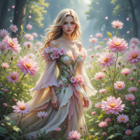 The image depicts a female figure with long blonde hair, positioned centrally and looking slightly off-camera. She wears a flowing dress that resembles floral or fairy-like attire, predominantly in pastel hues such as pink and white. The dress features intricate patterns and designs, enhancing the ethereal appearance. The figure is surrounded by flowers, specifically what appears to be daisies due to their recognizable shape with a cluster of petals around a central disc-like feature. The flowers are in full bloom and cover the ground around her, creating a lush carpet that extends into the background. The style of the artwork suggests a fantasy or dreamlike quality to the scene, with soft lighting contributing to the serene atmosphere.