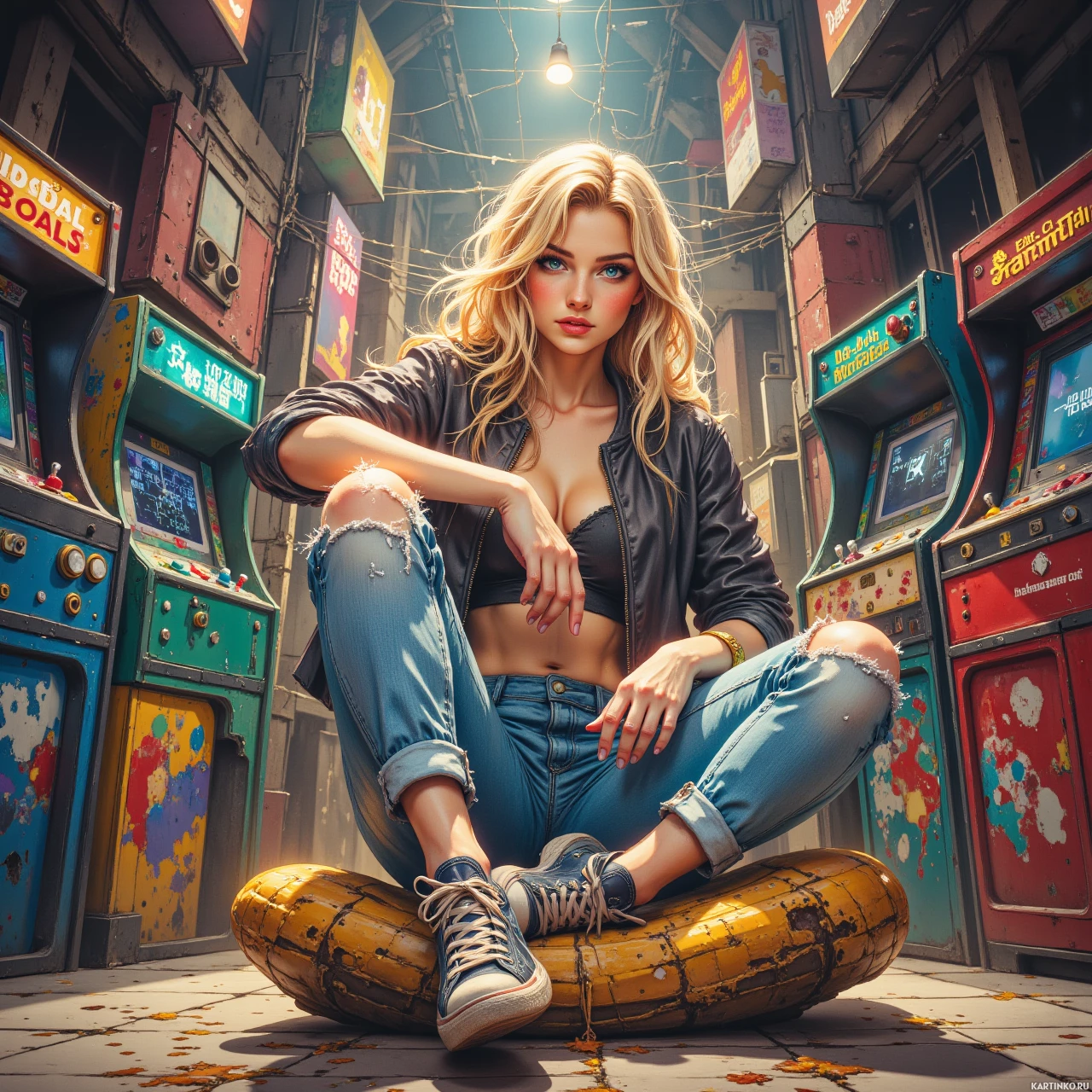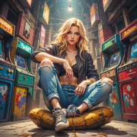 На картинке изображена девушка, сидящая между двумя игровыми автоматами. У неё длинные светлые волосы, на ней чёрная куртка поверх топа с порванными на плечах рукавами, джинсы и кроссовки. Она сидит непринуждённо, одна рука лежит на бедре, а другая поддерживает подбородок. На заднем плане видны неоновые вывески и частично забор из сетки, создавая городской пейзаж.
