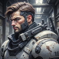 На картинке мужчина с короткой темной волосами и бородой, одетый в футуристическую броню, стоит внутри промышленного помещения, похожего на металлическую конструкцию. На его броне – металлический блеск, а на левой стороне груди видны провода или схемы. Он смотрит в сторону, на лице – серьезное выражение. На заднем плане — высокие потолки, поддерживаемые крупными трубами и открытой вентиляцией.